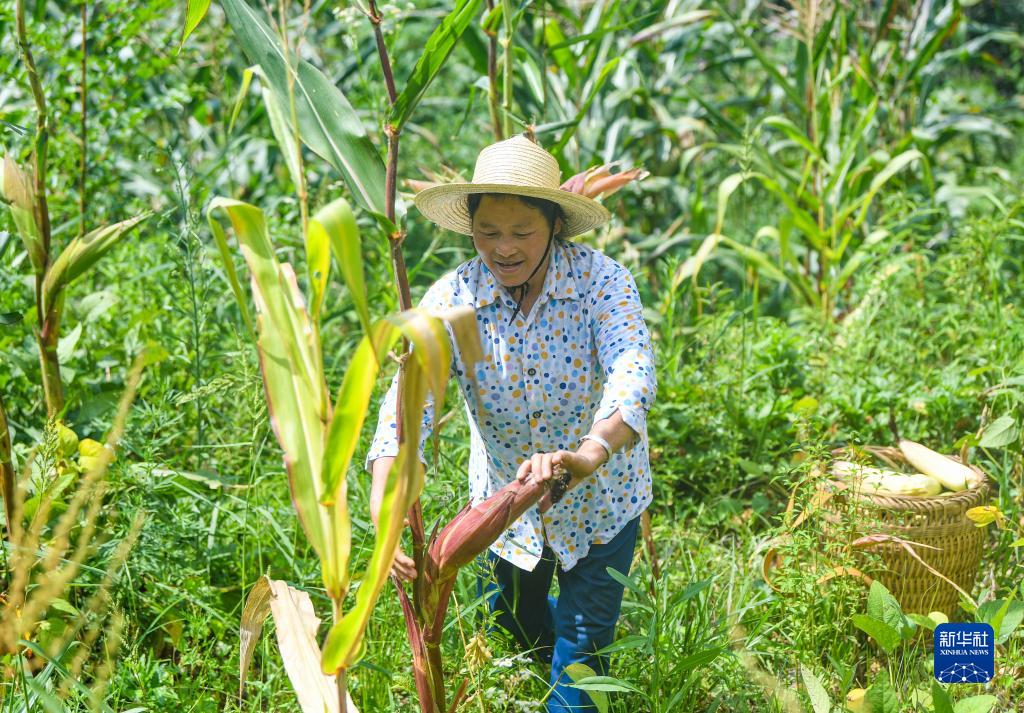 8月16日,村民在重慶市石柱土家族自治縣王家鄉光華村採摘玉米。