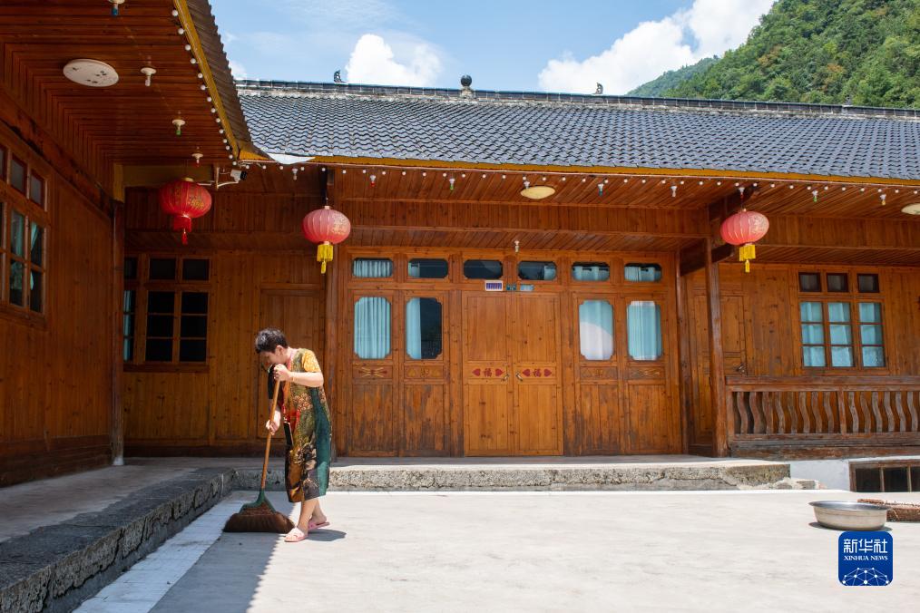 下坪鄉周家院子的主人熊翠蘭在打掃院子(8月17日攝)。