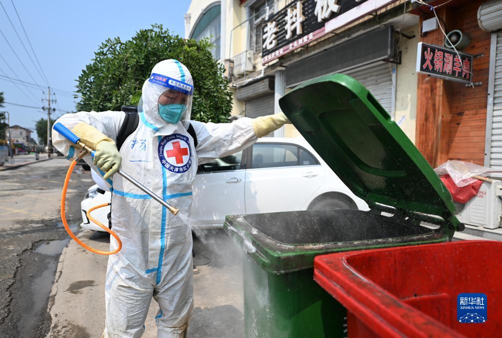 8月17日,工作人員在天津市靜海區&頭鎮進行消殺作業。