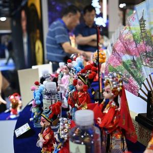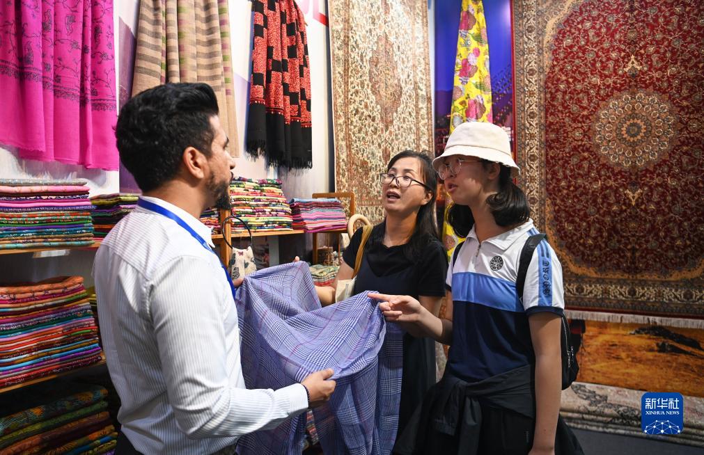 8月17日,參觀者在交流合作館尼泊爾展區了解特色商品。