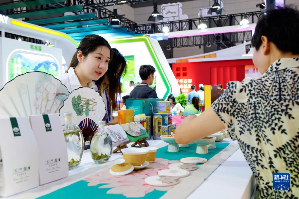 8月17日,參觀者在産業成果館商洛展區了解特色商品。