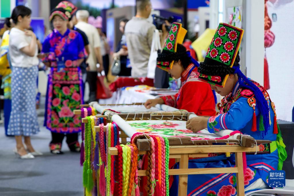 8月17日,在産業成果館漢中展區,非遺傳承人展示刺繡技藝。