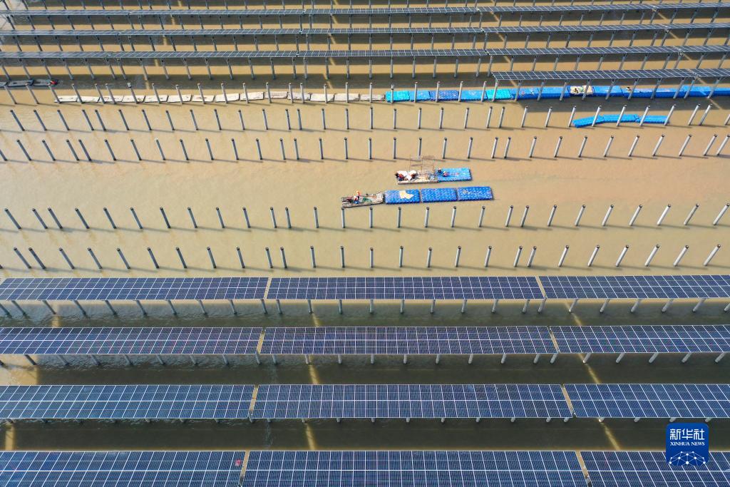 8月17日拍攝的三門灘塗光伏電站施工現場(無人機照片)。