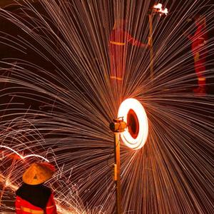 8月16日晚,在鄂爾多斯文化産業園景區,民間藝人表演“鐵花秀”。