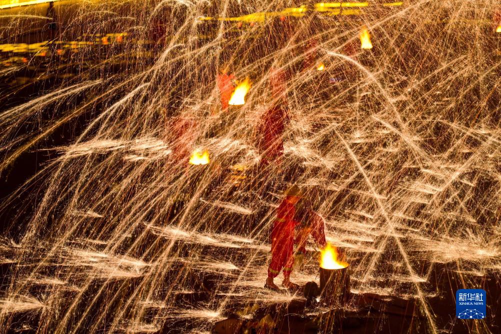連日來,內蒙古伊金霍洛旗鄂爾多斯文化産業園在景區舉辦“華夏鐵魂”主題鐵花秀活動,民間藝人將燒紅的鐵水在半空中散開,迸濺形成萬千火花,構成壯麗的圖景,成為當地夜經濟的亮點,吸引眾多游人前來觀賞。活動將持續到8月27日。