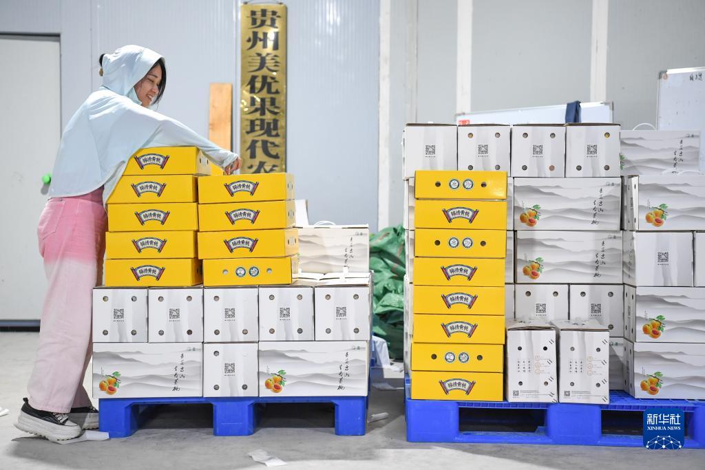 8月17日,工作人員在貴州省貴定縣德新鎮新鋪村黃桃種植基地的車間檢查黃桃包裝。