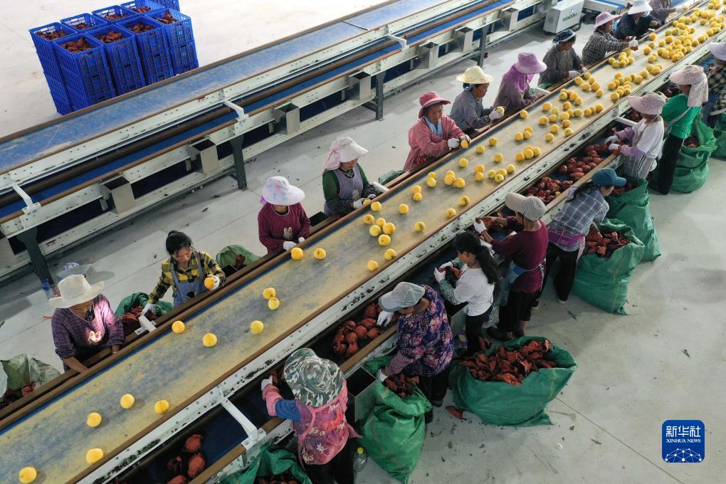 8月17日,村民在貴州省貴定縣德新鎮新鋪村黃桃種植基地的車間分揀黃桃。