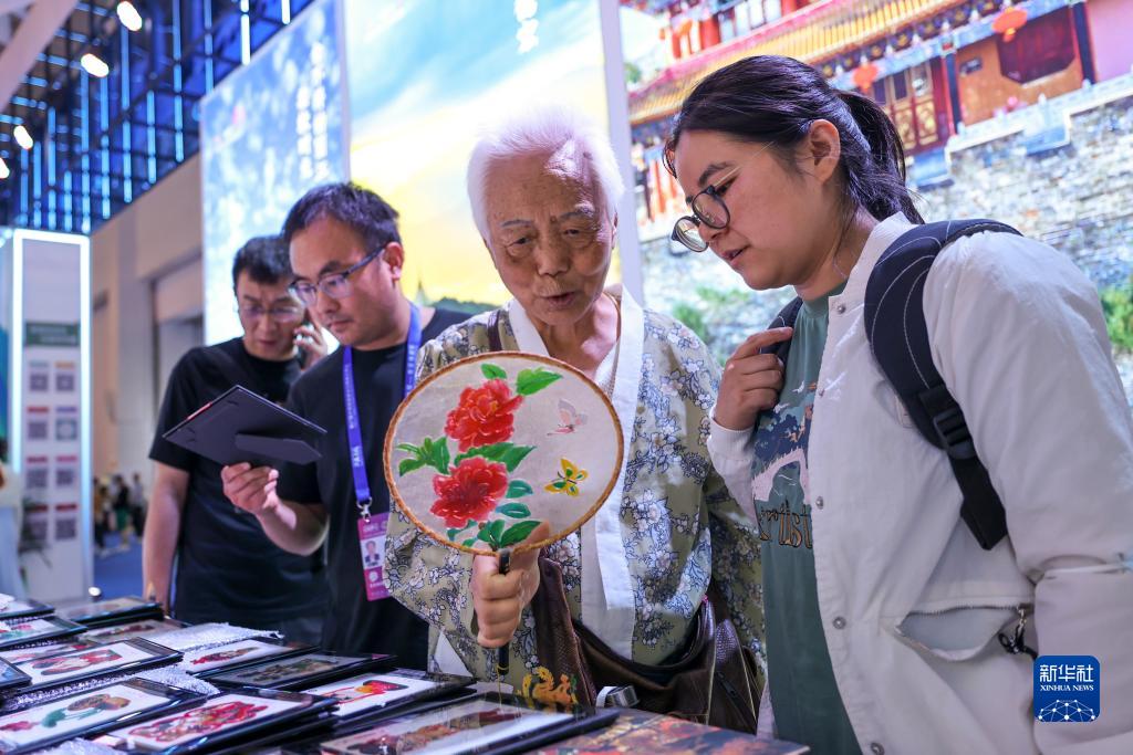 8月17日,參觀者在雲南騰衝皮影展位上選購特色商品。
