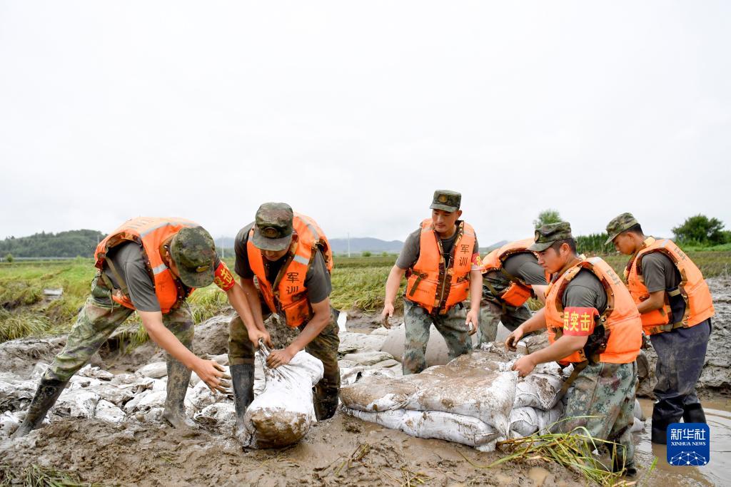 北部戰區陸軍某旅官兵在舒蘭市金馬鎮執行加固堤壩任務(8月13日攝)。