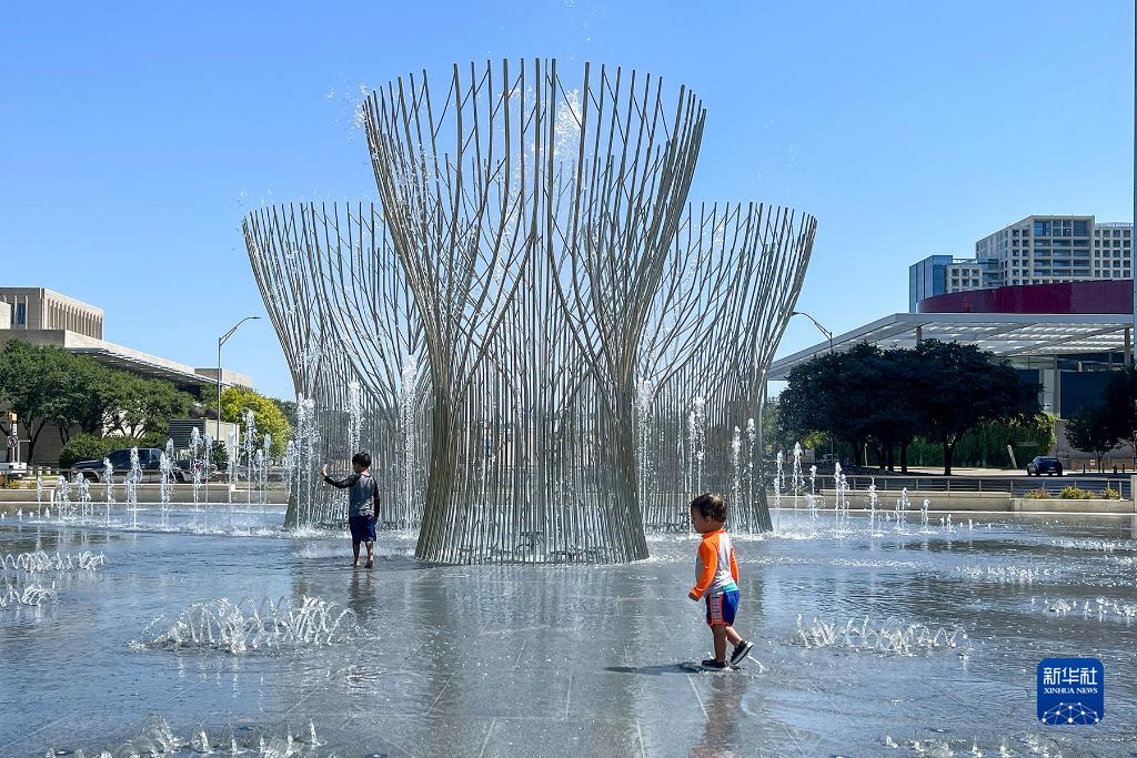 8月17日,兒童在美國得克薩斯州達拉斯市一處噴泉嬉戲。