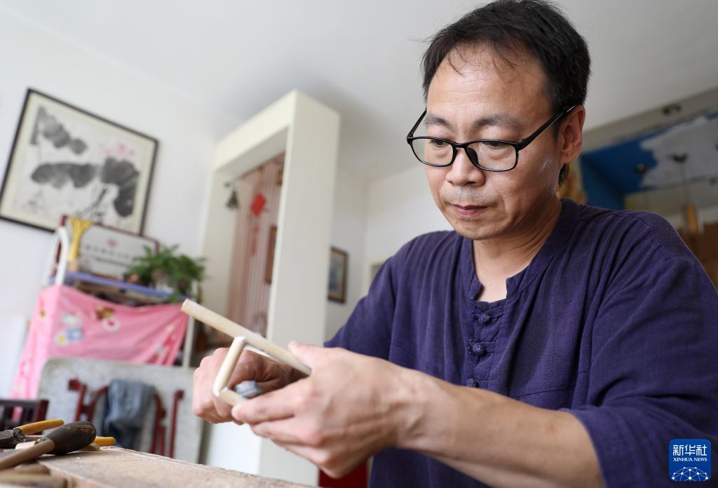 8月17日,崔凱在遼寧省營口市自己家中製作吉祥輪彩紙風車骨架。