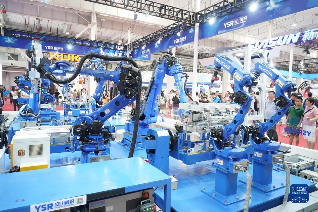這是在2023世界機器人大會現場拍攝的新能源電池盒機器人智能生産線(8月17日攝)。
