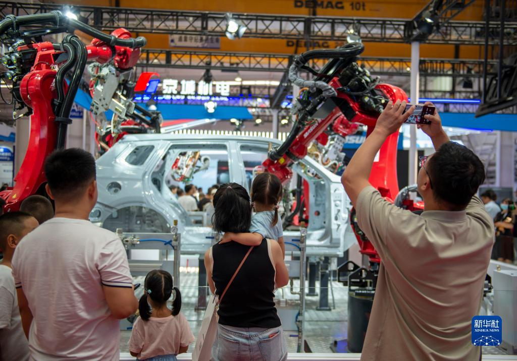 8月17日,參觀者在2023世界機器人大會“機器人+製造業”區域參觀。