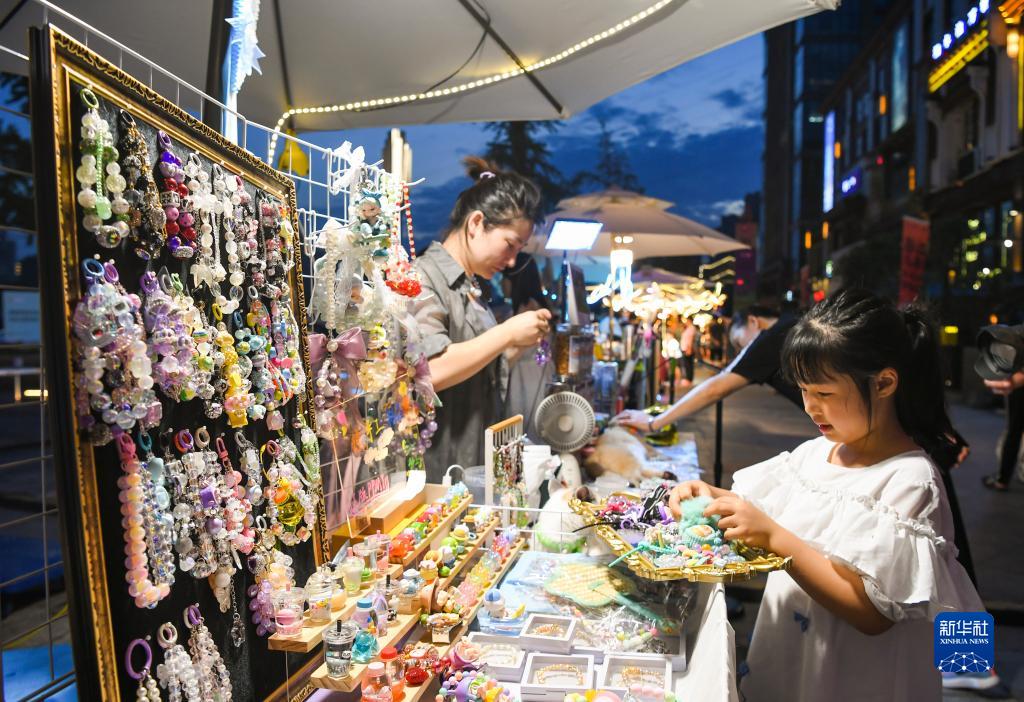一名女孩在重慶市江北區鎏嘉碼頭的小熊集市選購飾品(8月4日攝)。