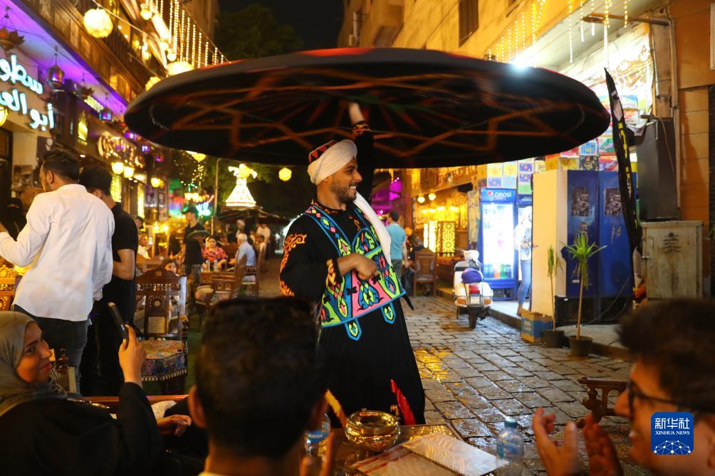 一名藝人為埃及開羅哈裏裏市場夜市一家店舖的顧客表演大裙舞(7月28日攝)。