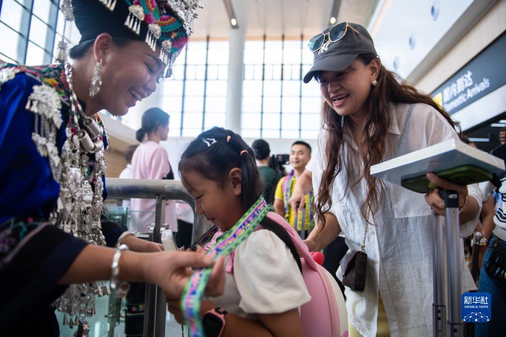 8月18日,當地群眾在湖南湘西邊城機場向抵達的旅客贈送花帶。