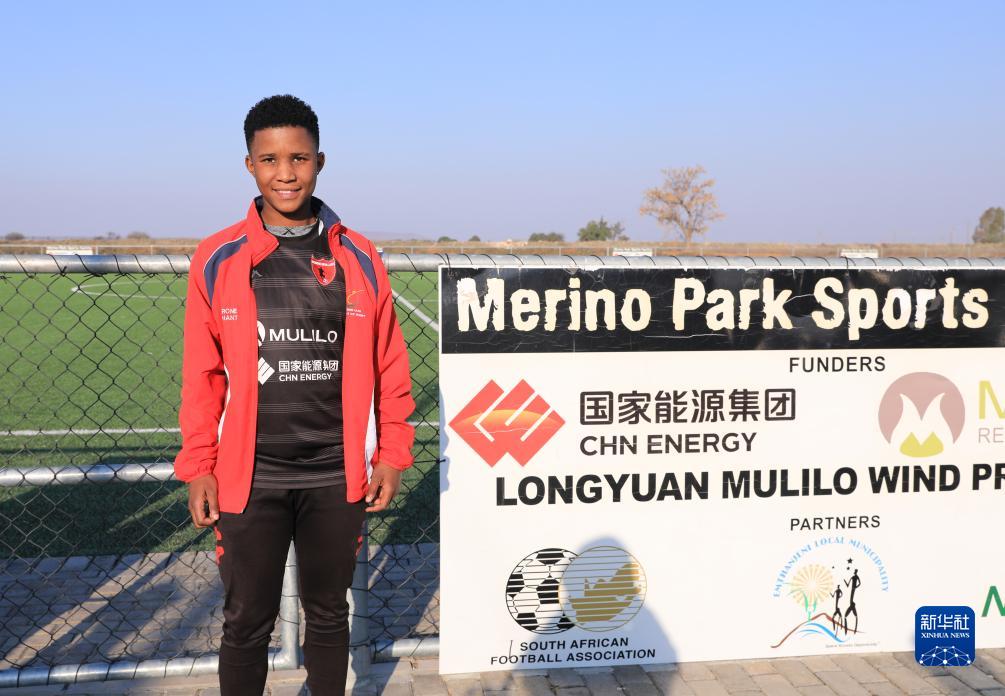 8月10日,在南非北開普省德阿鎮,當地女中學生莎倫·奧利芬特在由龍源南非公司翻修一新的足球場邊接受採訪。