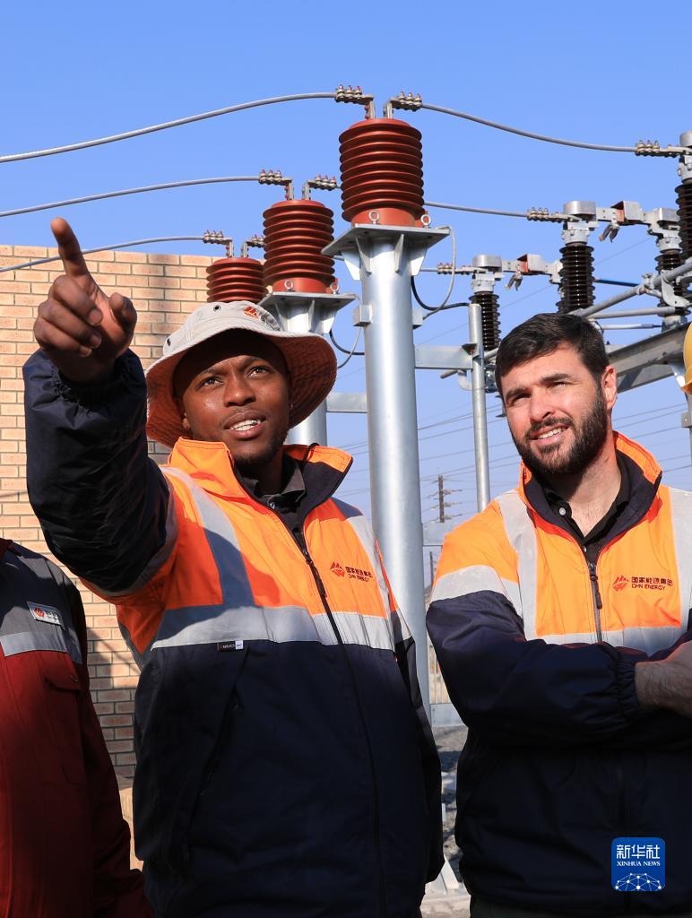 8月10日,在南非北開普省德阿鎮,當地居民、變電站工作人員達斯溫·巴松(左)與變電站副主管雷加特·范滕德在龍源南非公司德阿風電項目變電站查看。
