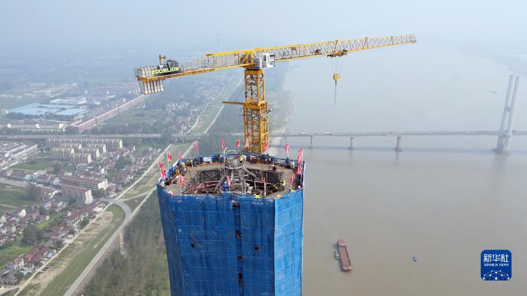 8月18日拍攝的京&高速銅陵長江公鐵大橋3號主塔封頂施工現場(無人機照片)。