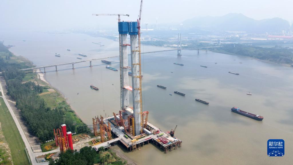 8月18日拍攝的封頂完成的京&高速銅陵長江公鐵大橋3號主塔(無人機照片)。