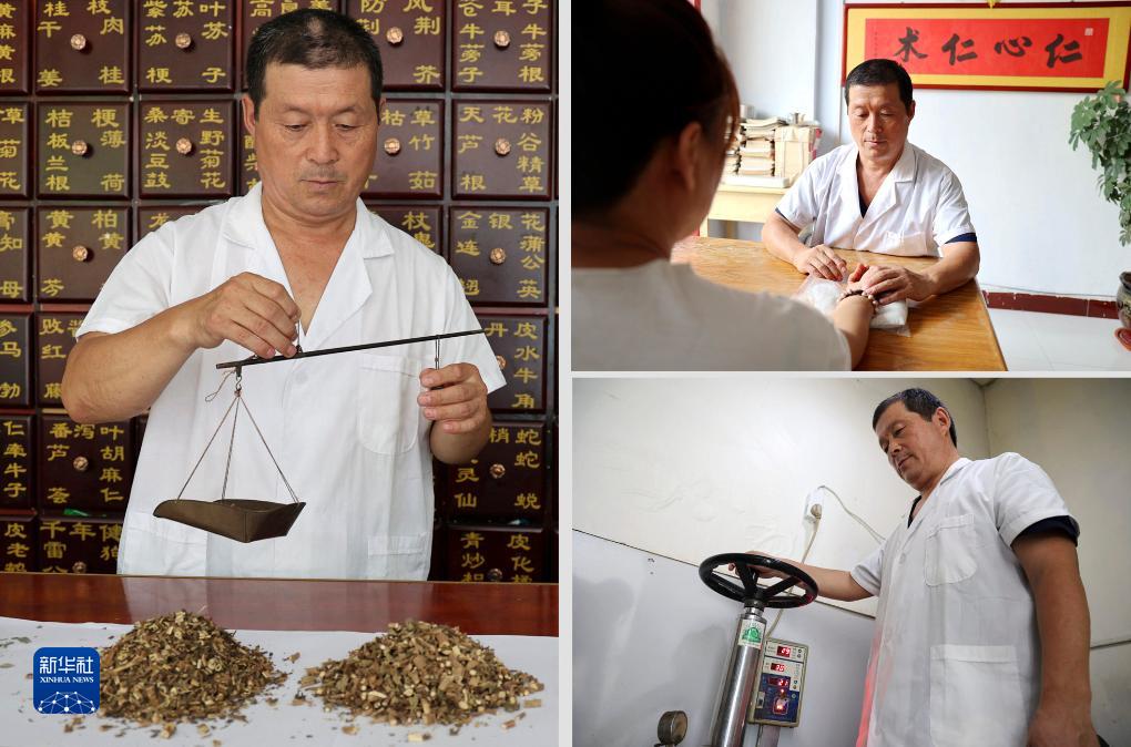 這是山東省濱州市濱城區市中街道一處中醫診所的中醫師初志卿,從醫33年(拼版照片)。左圖為初志卿在中醫診所稱量中藥(7月28日攝);右上圖為初志卿在給前來就診的患者把脈診斷(8月17日攝);右下圖為初志卿在熬製中藥湯劑(8月17日攝)。