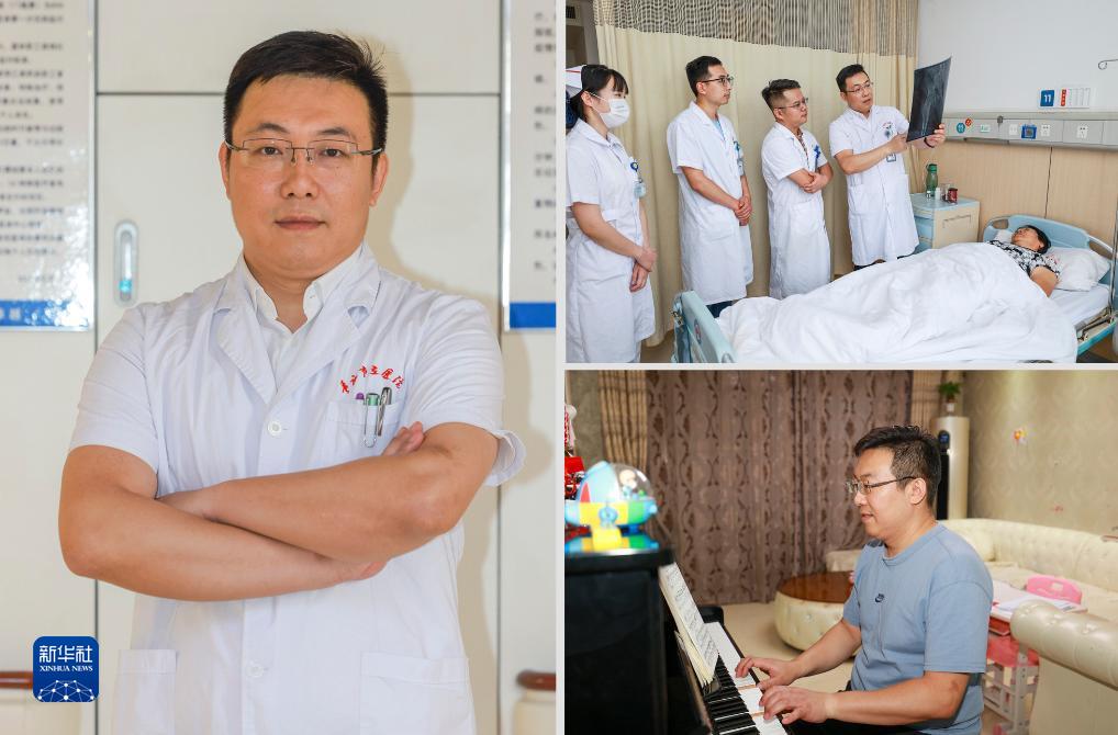 這是山東省棗莊市市立醫院關節運動醫學科主任、副主任醫師張慎啟,從醫11年(拼圖照片,均為8月17日攝):左圖為張慎啟在醫院的辦公室留影;右上圖為張慎啟(左四)在給住院患者查房制定下一步治療方案;右下圖為張慎啟下班後在家彈琴放鬆。
