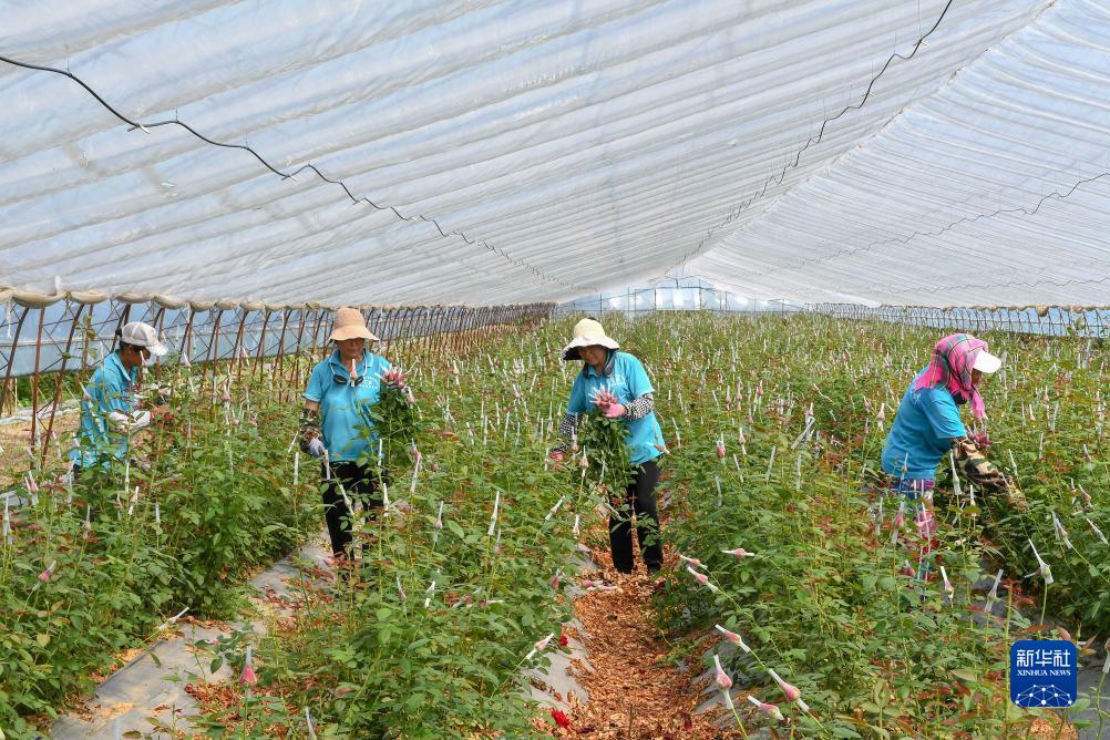 8月17日,農民在吉林省德惠市朱城子鎮沿河村程雪家庭農場採摘玫瑰花。
