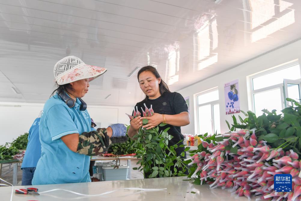 臨近七夕,位於吉林省德惠市朱城子鎮沿河村的程雪家庭農場玫瑰大棚內一派繁忙景象。負責人楊雪帶領村民關注花朵長勢,計算着花期,適時進行採摘。