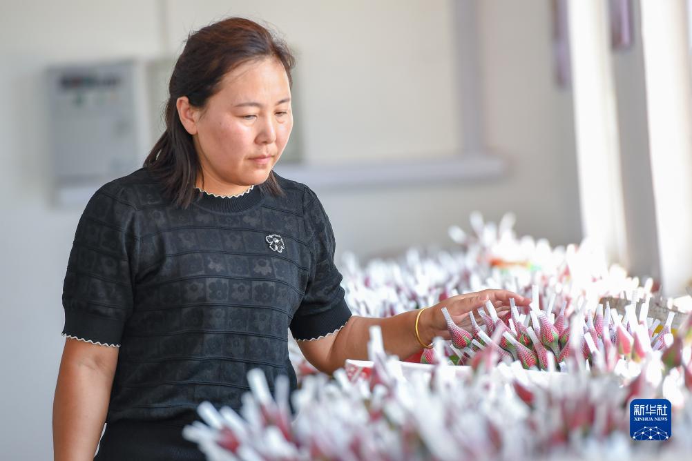 8月17日,吉林省德惠市朱城子鎮沿河村程雪家庭農場的負責人楊雪查看打包好的玫瑰花。