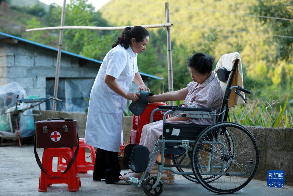 羅海香(左)為一名行動不便的村民測量血壓(8月16日攝)。