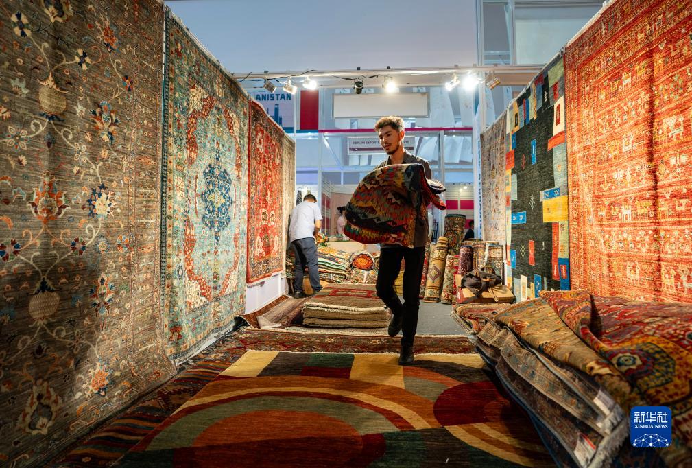 在阿富汗展區,一名參展商在搬運地毯(8月16日攝)。