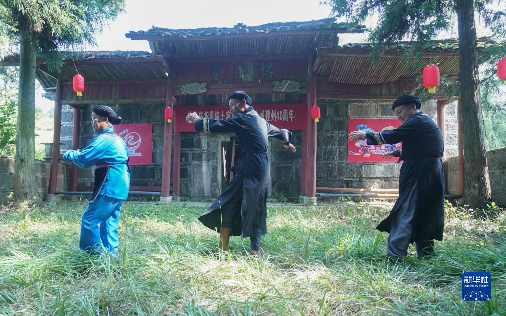 8月18日,舍米湖村村民在有着數百年歷史的“擺手堂”前跳起擺手舞。