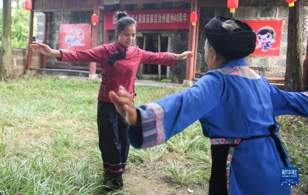 舍米湖村村民黎梅圍(左)跟着老人練習擺手舞(8月18日攝)。