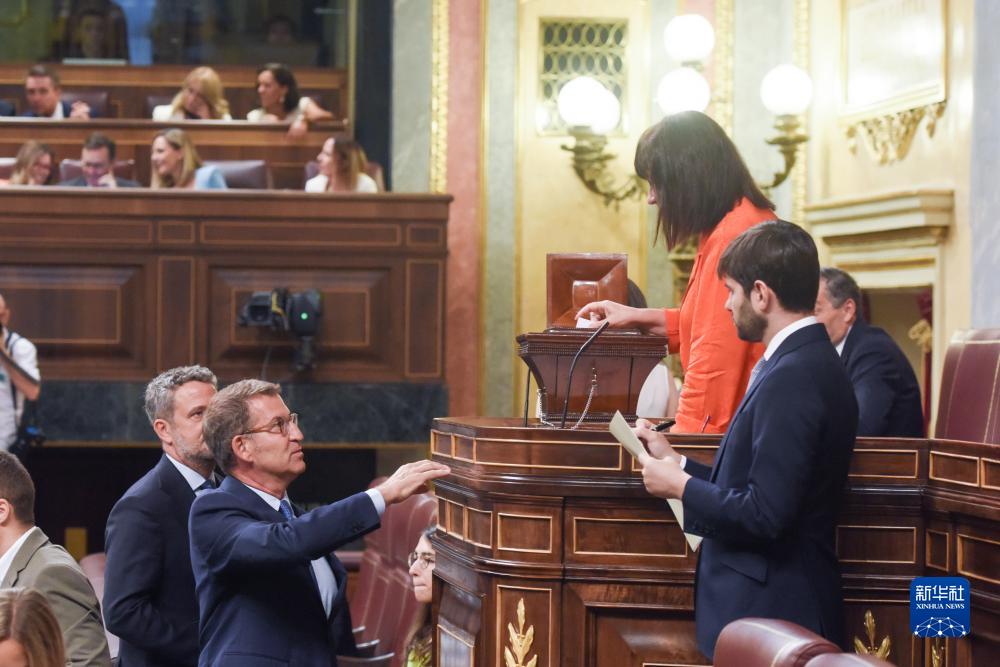 8月17日,在西班牙馬德里,人民黨領導人阿爾韋托·努涅斯·費霍(前左)在議會進行投票。