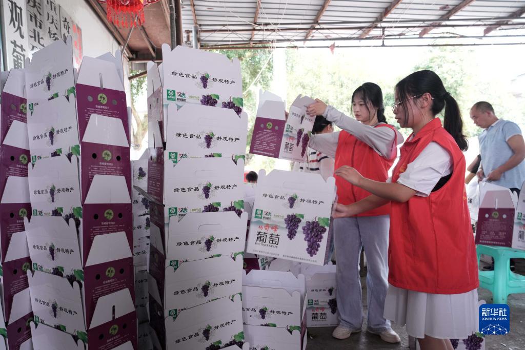 8月18日,在重慶市北碚區靜觀鎮奇峰葡萄園,西南大學學生在幫助果農整理葡萄包裝箱。