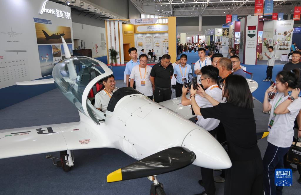 8月18日,客商在第三屆RCEP區域(山東)進口商品博覽會上了解體驗一款國産小飛機。