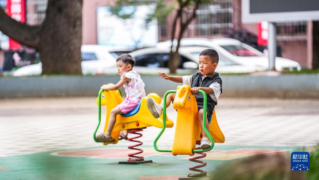 小朋友在六盤水市鍾山區黃土坡街道文明巷小區中心廣場玩耍(8月17日攝)。