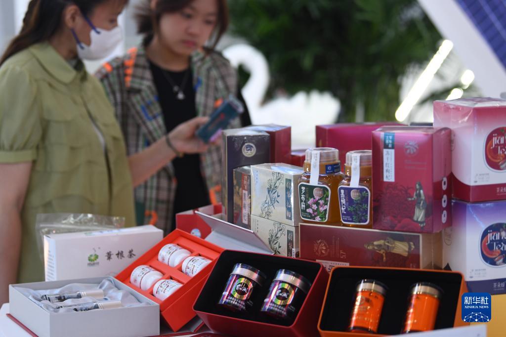 8月18日,在2023(中國)亞歐商品貿易博覽會上,市民在挑選産自新疆尉犁縣的羅布麻系列産品。