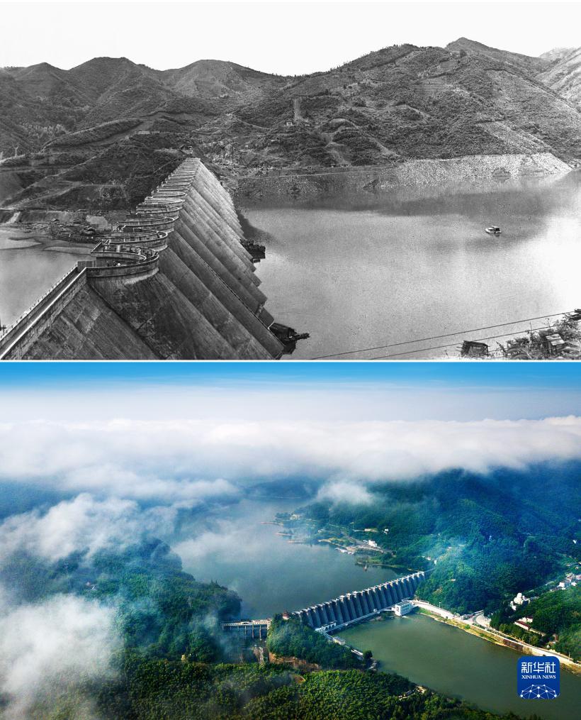 這是一張拼版照片。上圖為:拍攝的位於安徽省六安市金寨縣的佛子嶺水庫(資料照片,新華社發 樓並銓攝);下圖為:2021年8月8日拍攝的佛子嶺水庫(無人機照片,新華社發 蔣常虹攝)。