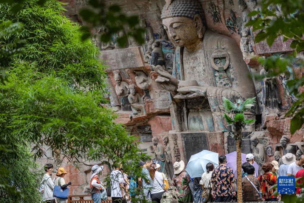 8月19日,游客在大足石刻寶頂山景區參觀。