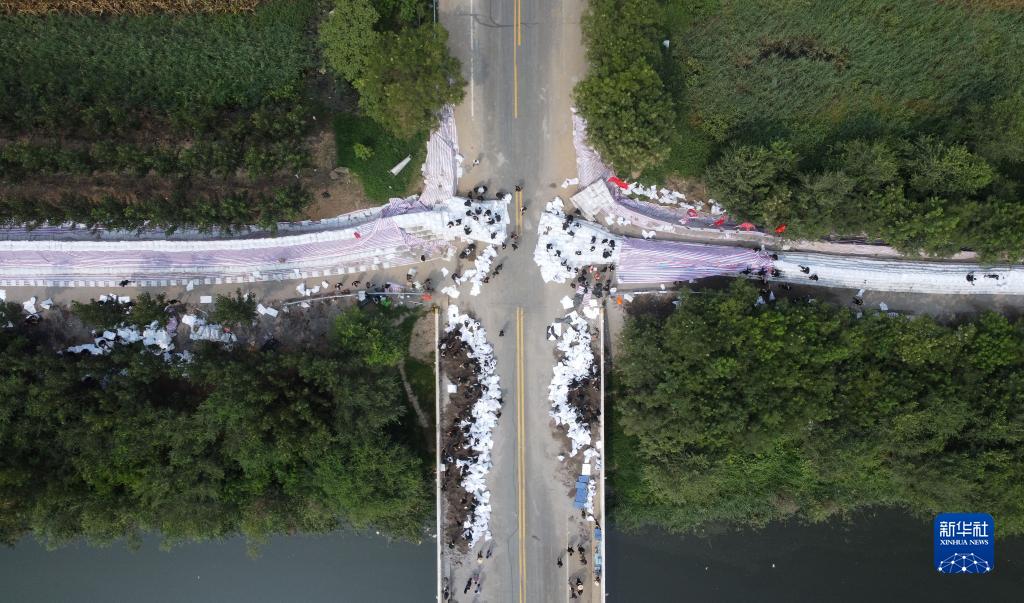 8月10日,武警第一機動總隊某支隊官兵在大清河支渠橋處搶築堤壩(無人機照片)。