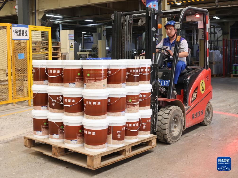 8月19日,工人駕駛叉車在龍牌塗料北京有限公司涿州分公司塗料車間搬運塗料産品。
