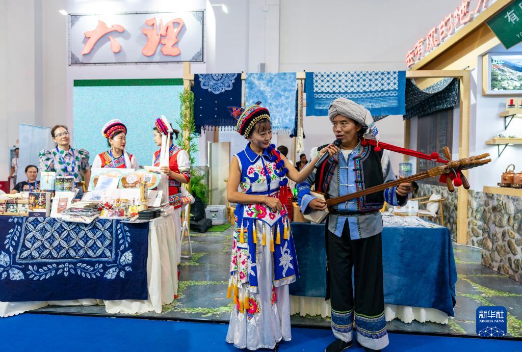 8月16日,劍川白曲國家級非遺傳承人姜宗德(右)、省級非遺傳承人李寶妹在南博會文化旅游館內表演。