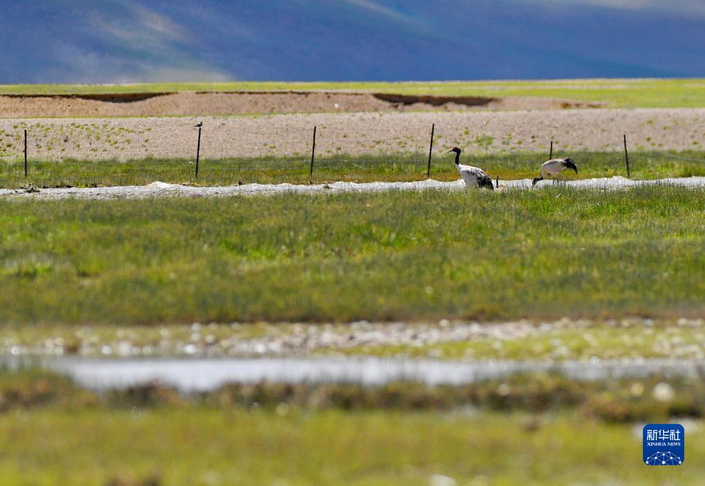 措勤縣濕地深處的黑頸鶴(8月18日攝)。