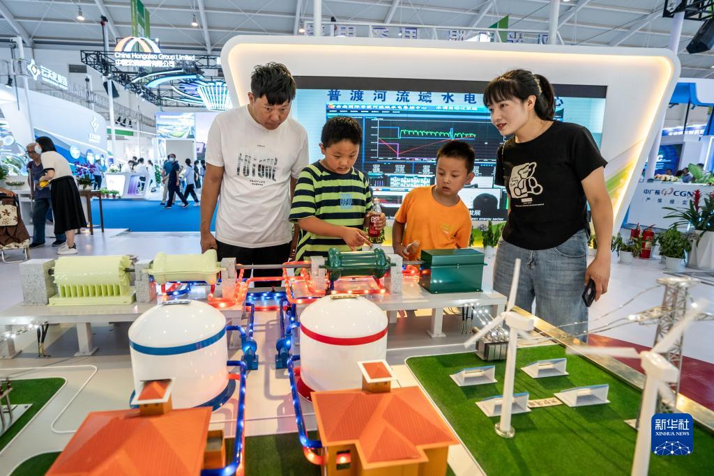 8月19日,在第七屆中國—南亞博覽會國家電投展區,家長帶着孩子參觀展覽。