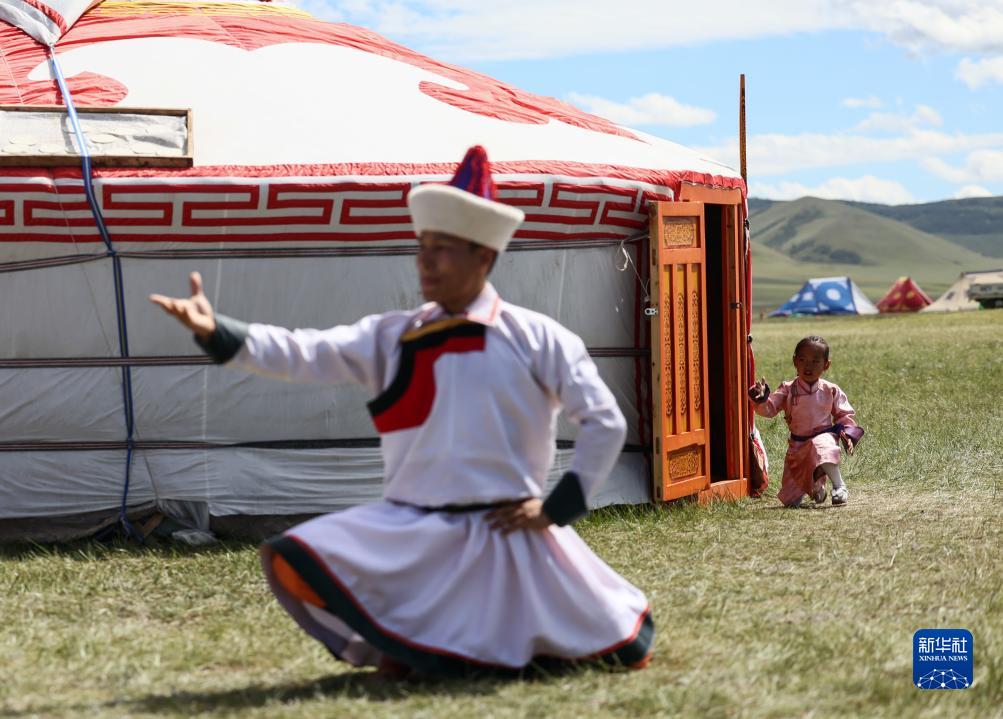 8月19日,在蒙古國泰吉山谷舉辦的文化節上,一名女童在場下模仿演員的舞蹈動作。