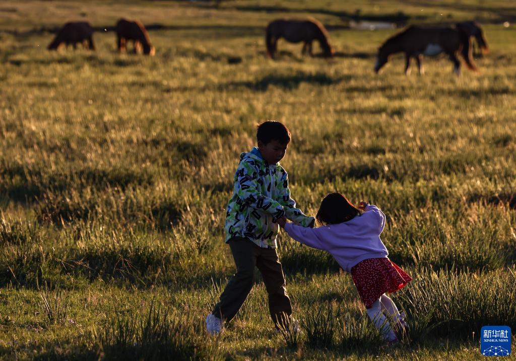 這是8月18日在蒙古國泰吉山谷拍攝的在夕陽中嬉戲的孩子。