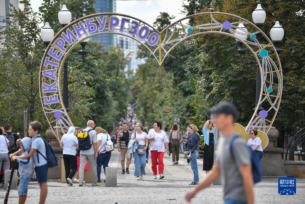 8月19日,人們從俄羅斯葉卡捷琳堡建城300周年的裝飾旁走過。