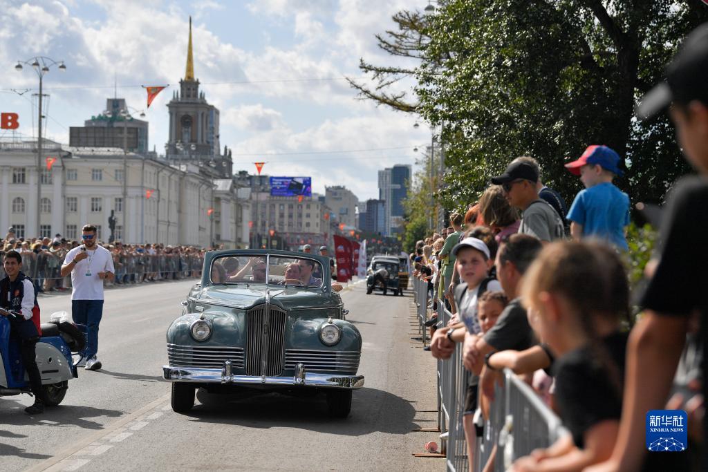 8月19日,人們在俄羅斯葉卡捷琳堡觀看復古車輛游行。