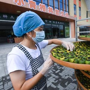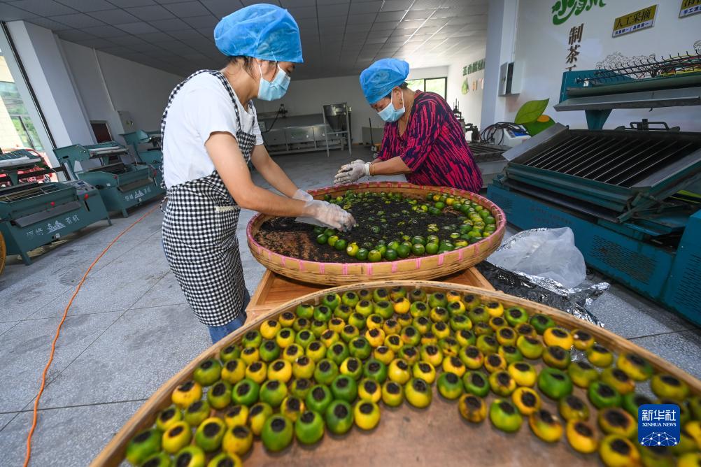 8月20日,在浙江省建德市三都鎮松口村的小青柑共富工坊,工人忙着填充茶葉,將新鮮的小青柑加工製成青柑茶。
